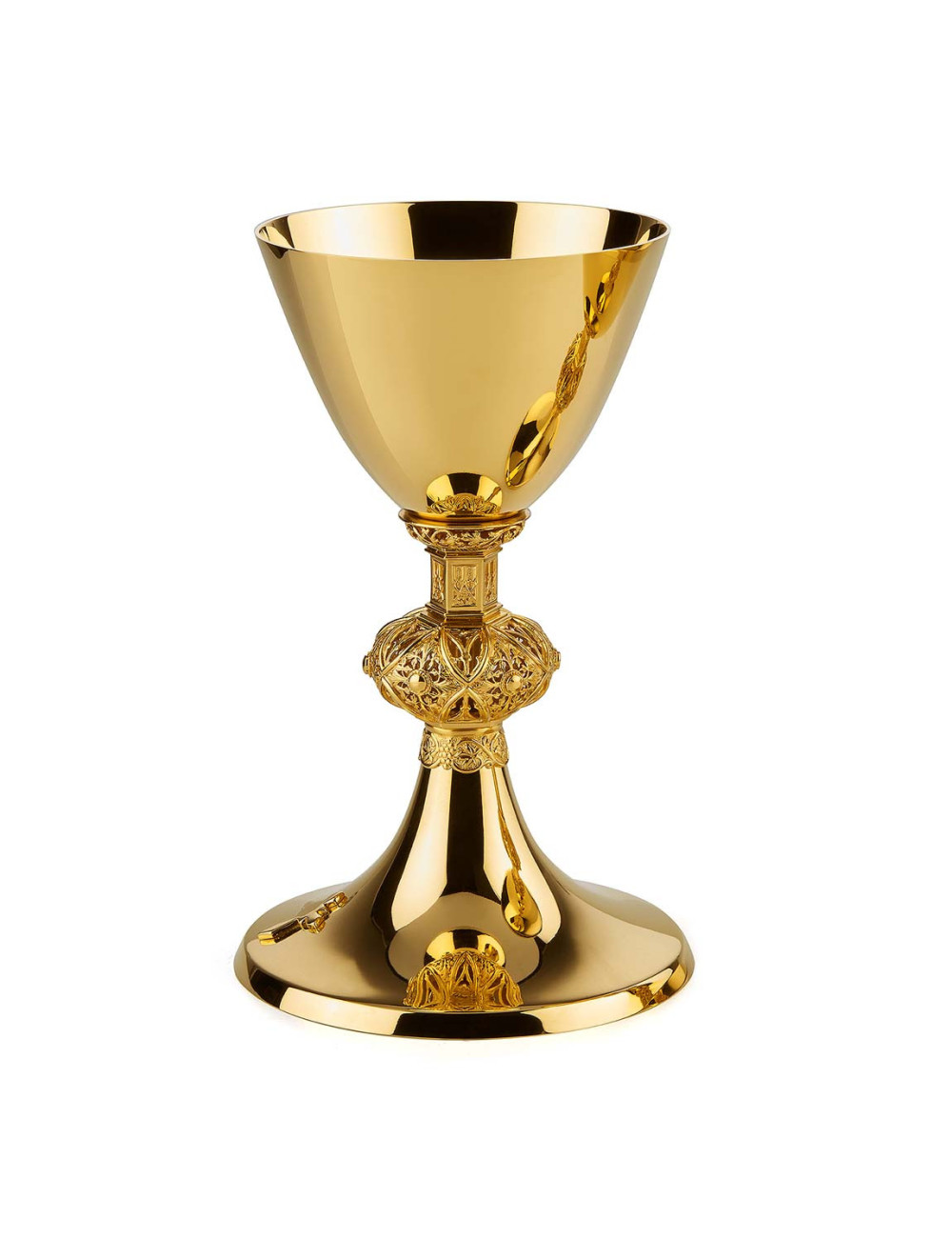 Cáliz realizado en metal acabado en baño de oro de 24 quilates con una altura de 16 cm.