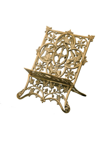Atril de mesa fabricado en metal (acabado su color, plateado, dorado o dos tonos) de rica ornamentación a base de símbolos Alpha & Omega y Agnus Dei.