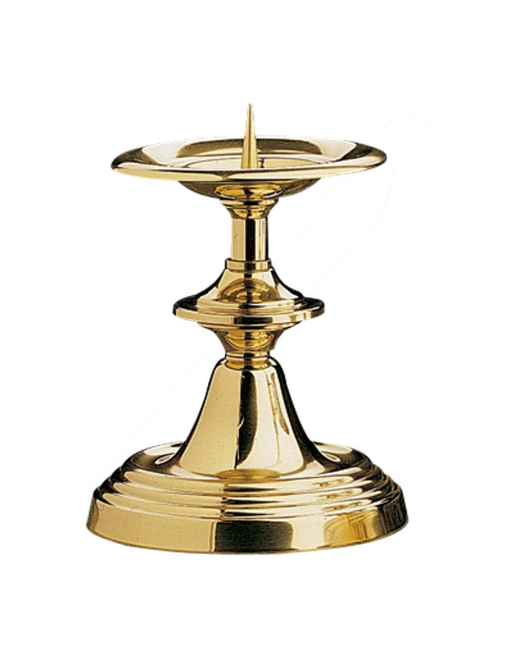 Candelero de Altar moderno realizado en bronce su color con unas medidas de 8 cm de alto y 15 cm de diámetro. Disponible con mechero o con pincho.