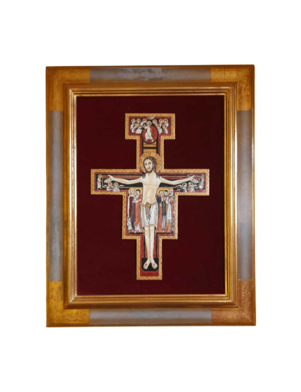 - Frame made in decorated wood and lined with red velvet. This frame has a Saint Damiano's cross made in enamel.