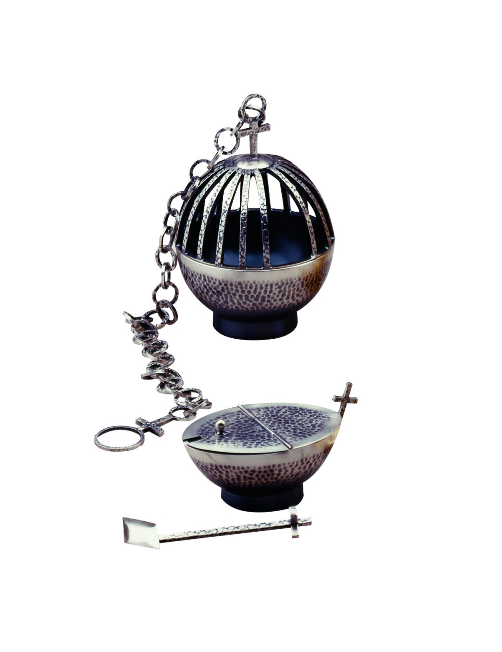 - El incensario, la naveta y la cucharilla están decoradas ligeramente con martelé a mano.