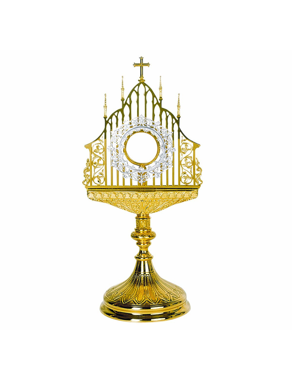 Gothic style Monstrance made in gold plated brass and decorated with filigree around the luna.