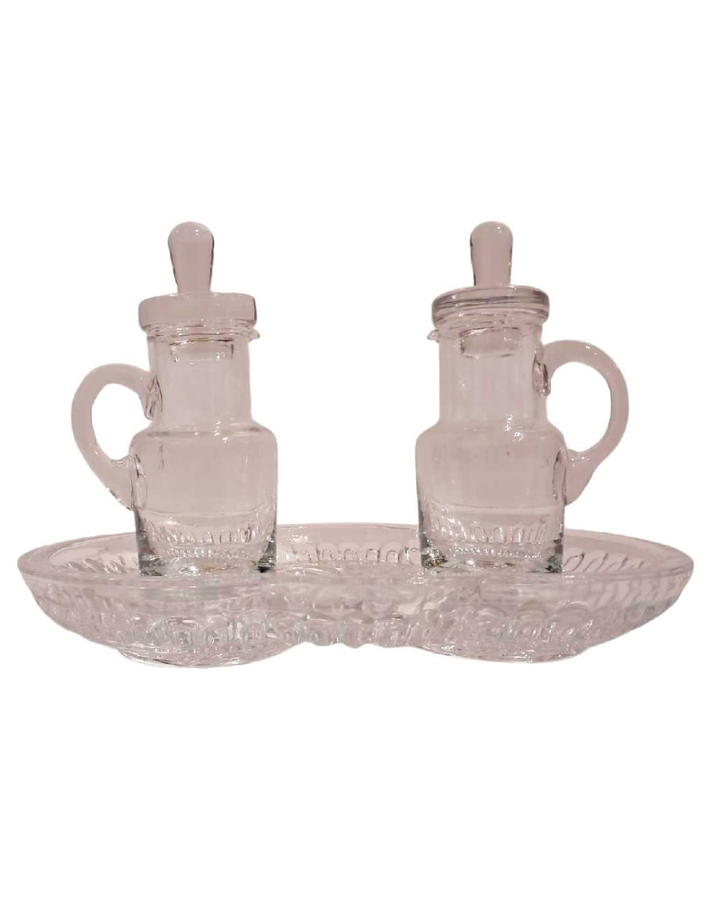 Cruet set made in glass and brass (silver plated or gold plated). This Cruet set has the following dimensions: Cruet: 4" 3/4 high x 3"1/8 wide. Tray: 9" 1/2 long x 4"1/4 wide.
