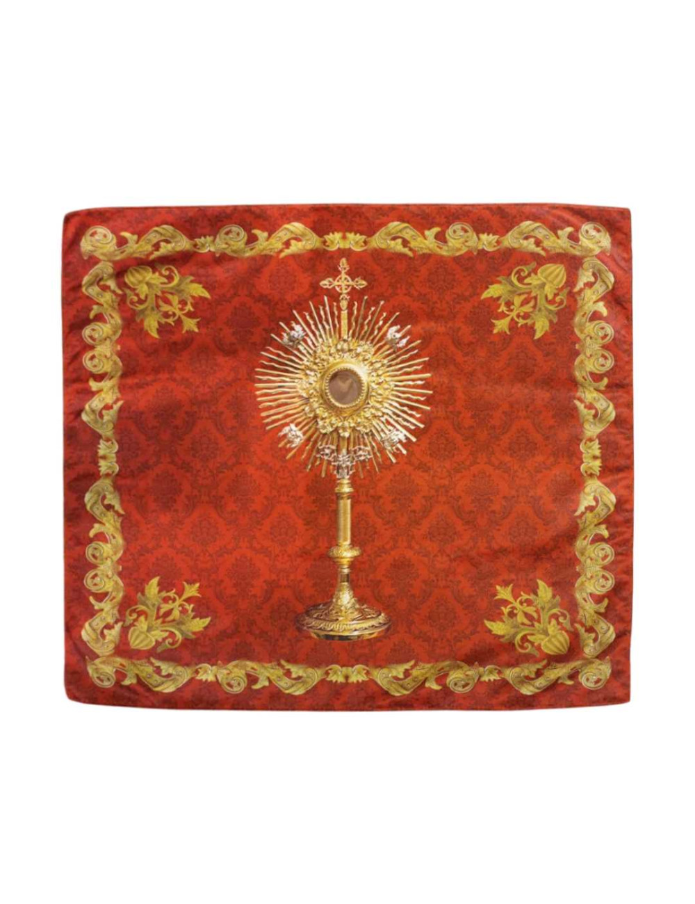 Corpus Christi tapestry. Printed tapestry with the image of the monstrance in the center and floral motifs bordering the entire drapery. It measures 130 cm long x 110 cm high.