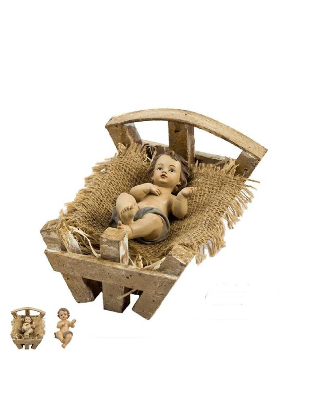 Jesus Child image made in colored resin placed in a crib made in wood, straw and matting. The child is 10 cm long.