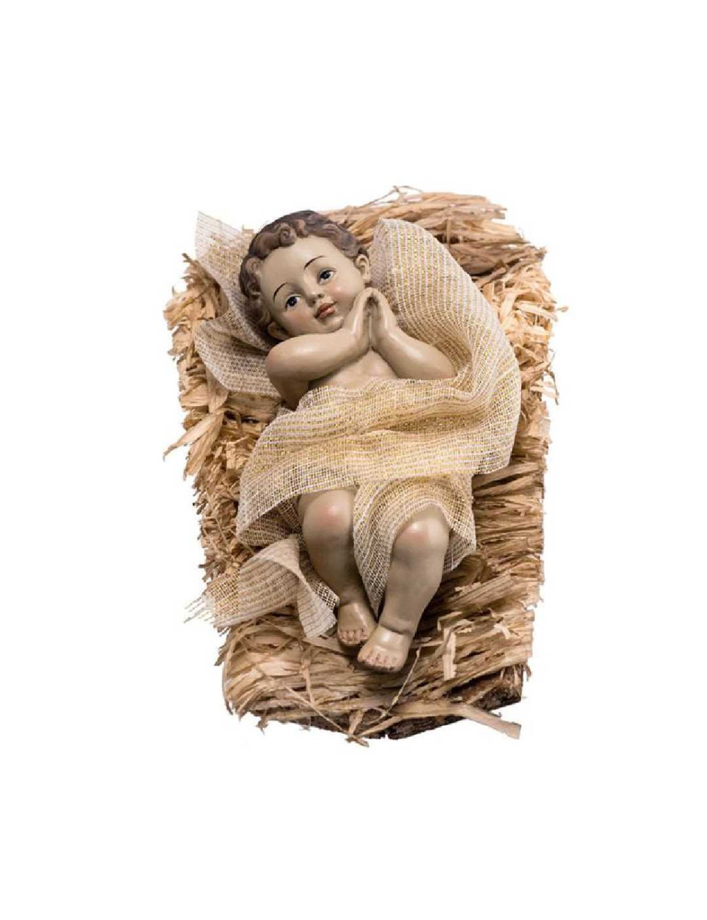 Jesus Child image made in colored resin placed in a crib made in wood and straw. The child is 15 cm long.