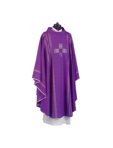 Casulla confeccionada por Santarrufina realizada en mixto lana de color morado con galón central con motivo de cruces rematado con cordoncillo. Lleva estola a juego. Se trata de una PIEZA ÚNICA.