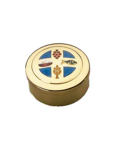 Portaviático con patena de estilo moderno realizada en metal con baño de oro de 24 quilates con esmalte y motivo de cruz y peces.