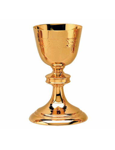 Consultar precioCáliz realizado en metal plateado, con la copa interior en plata de ley, de estilo Gótico decorado con un profundo repujado. También disponible totalmente en plata de ley.