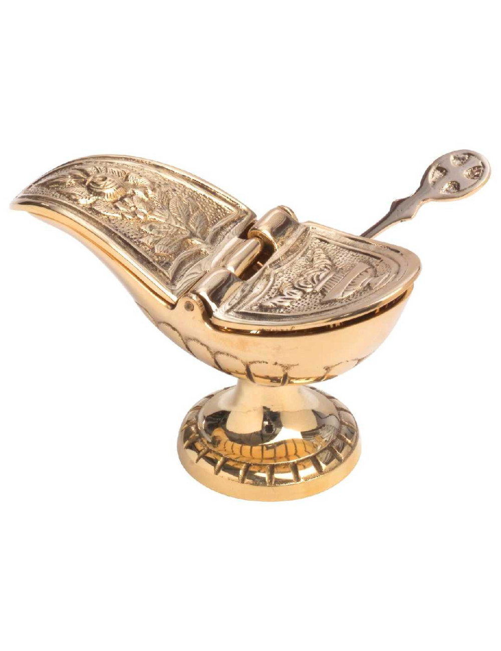 Naveta y cucharita de estilo barroco realizadas en metal su color decorado con motivos de flores. Tiene unas medidas de 13 cm de largo x 7 cm de alto x 6 cm de ancho.