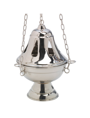 Incensario realizado en metal niquelado de líneas lisas con unas medidas de 17 cm de alto (sin contar las cadenas).